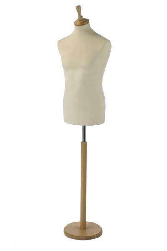 Herenbuste / paspop, materiaal buste piepschuim, met een ecru hoes. Een beuken ronde houten voet en een TS ( staande beuken houten ) eindkap.
